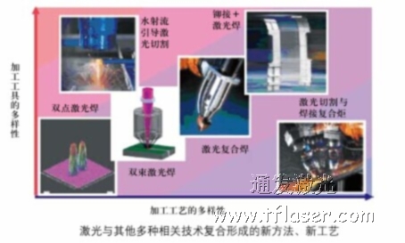 就拿激光焊接技術(shù)來說,在激光復(fù)合工藝的發(fā)展中已出現(xiàn)了如雙點或雙束激光的復(fù)合、激光與電弧的復(fù)合、激光與攪拌摩擦熱復(fù)合以及激光與電阻熱復(fù)合等形式;并呈現(xiàn)與其他相關(guān)技術(shù)結(jié)合及功能延伸的趨勢,如與水射流、鉚接等結(jié)合而形成的新工藝(見圖)。